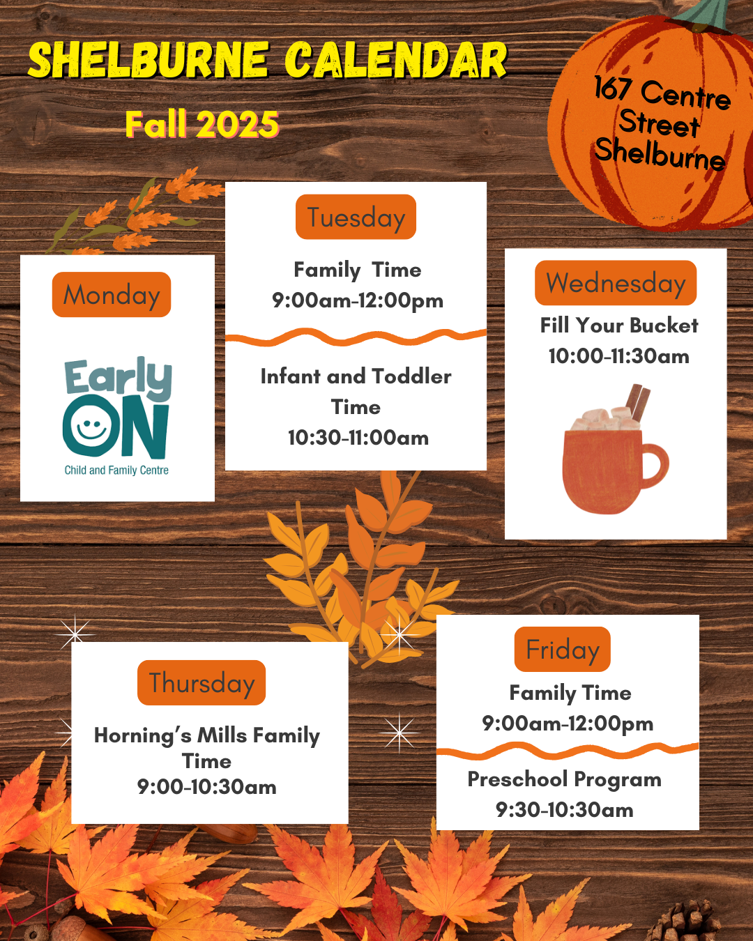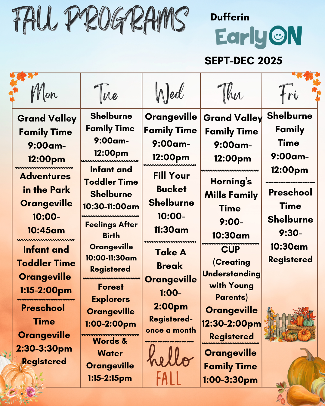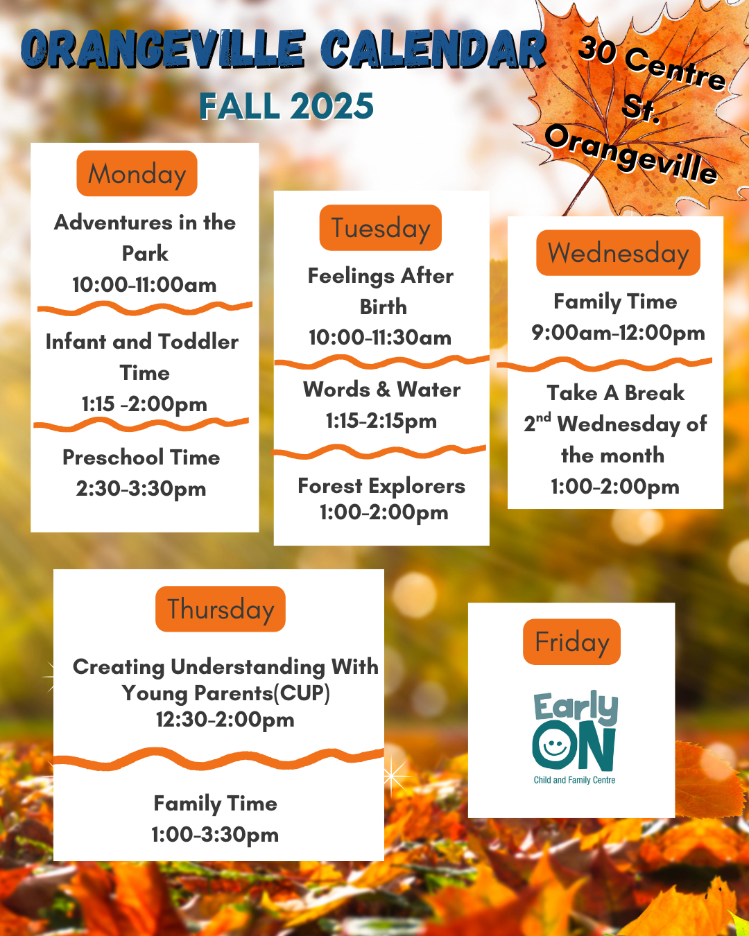 EarlyON Child and Family Centres are offering indoor, virtual, and outdoor programming at this time. For the most current information please visit our Facebook Page, Instagram, or call/text our Ask EarlyON phone line anytime at 519-938-0559.